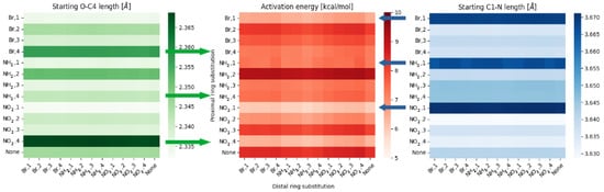 Heatmaps of the activation energy (middle), O—C4 distance (left) and N—C1 distance (right) for different substitution patterns within meta compounds group.