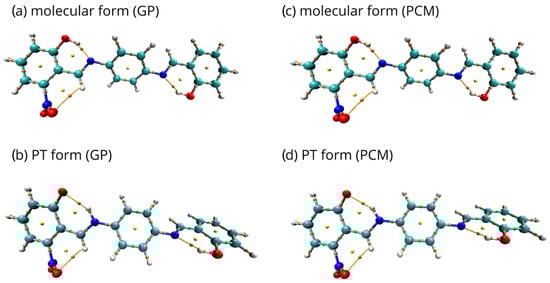 Although the PCM solvent environment affects the polarization of the O-H and N-H bonds, the involvement of the atoms in the intramolecular hydrogen bonding and quasi-ring systems brings larger stability to the electron density distribution and values of the partial atomic charges [,]. Consequently, the results for the PCM using water as the solvent are analogous to those obtained in the gas phase. This fact of similar electron density distribution in both phases is in agreement with our earlier remarks on the energetic parameters. The PCM results confirmed our expectations, based on previous experience [,], that the introduction of solvent did not change the molecular covalent skeleton topology.