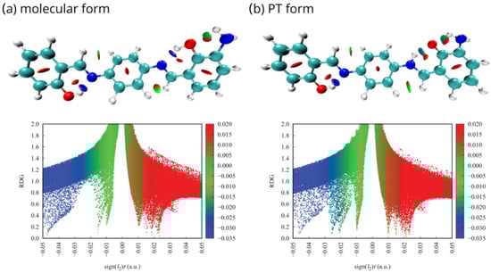 NCI gradient isosurfaces and scatter graphs for the para isomer monosubstituted with the –NH group in the proximal position 4 in the gas phase: (a) molecular form, (b) proton-transferred form.