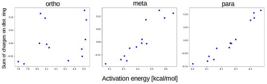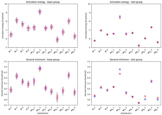While the activation energies for the proximal substitution retain the same pattern and variance, the distal effect gives even better defined ‘areas’ for each substitution type. While in the meta group the position of the distal substitution within the substituent type had a slight, but noticeable impact, in para the effects are even smaller, with the dominating factor being the distal substituent type. The statistical analysis yields similar results as in the meta group—standard deviation for the proximal effect is 0.89 ± 0.1, while for the distal effect is 0.15 ± 0.01.