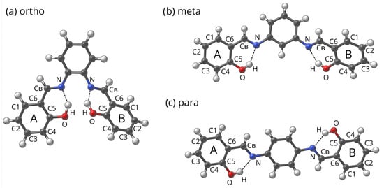 One of the most interesting (and potentially intricate) effects stemming from substitution is its influence on the hydrogen bonds (HBs) that may be located at or near the substituted part of the molecule []. HB is a non-covalent interaction, occurring when in the neighborhood of an X–H entity (where X is the donor atom), a second entity of the specific type is present (called the acceptor) [,]. Hydrogen bonding is an important and diverse molecular feature—it can be classified according to strength [,], symmetry (difference in electronegativity of donor and acceptor atoms, special shape of potential energy well) [], acceptor-donor locations (intra- or intermolecular) [] or even partially covalent character [,]. Hydrogen bonds can influence, e.g., reactivity, macro- and microscopic structure and molecular features, influence coordination in complexes, stabilize structure [,,,,,,]. In the contemporary science, the concept of hydrogen bonding is constantly evolving [,,,]. While in the typical case the hydrogen atom is close to the donor atom, the phenomenon of proton transfer is also a common occurrence []. It can be characterized by the activation energy and depth of the second minimum, associated with the proton path between the donor and acceptor atoms. This behavior can be studied via classical analytical methods (such as IR or NMR spectroscopy [,]), but it has also been proven that computational chemistry provides efficient tools for its description [,] by means of static or molecular dynamics simulations []. Intramolecular hydrogen bonds are one of the most significant molecular interactions responsible for the structure and properties of compounds under study—Schiff bases.