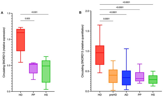 Circulating SNORD13 in HD and control groups (referring to Figure 1B).