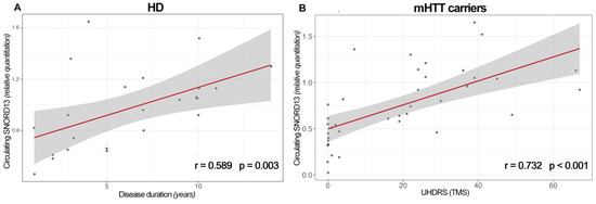 A positive linear correlation was observed between circulating SNORD13 levels and disease duration in patients with HD (r = 0.589, p = 0.003) (Figure 2A). A significant relationship was also observed between plasma SNORD13 and the UHDRS clinical score in mHTT carriers (r = 0.732, p < 0.001, Figure 2B), whereas it was not found to be significant in only overt patients with HD (not shown). These linear relationships remained significant when considering age as a covariate (partial correlations, r = 0.563, p = 0.01, and r = 0.685, p < 0.001, respectively).