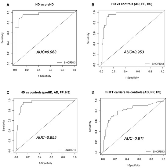 Assessment of SNORD13 as a biomarker of HD. ROC curves for discrimination between (A) symptomatic HD and premanifestomatic HD (pre-HD); (B,C) symptomatic HD and control groups; (D) mHTT carriers (HD and pre-HD) and control groups.