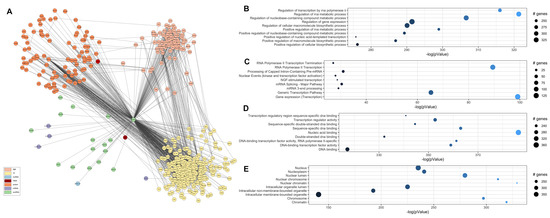 Finally, to investigate the biological landscape of the action of SNORD13, we constructed an interactome. We retrieved information on U13 snoRNA interactions with proteins (including known RNA-binding proteins (RBPs) and transcription factors (TF)), other snoRNAs, miRNAs, and rRNAs from the databases RNAinter [16], snoDB [17], and RNAct [18]. Additionally, we mapped the intra-network protein-protein interactions through STRING [19]. The final network comprised 456 SNORD3-interacting nodes: 258 TFs, 86 RBPs, 91 proteins, one long noncoding RNA, three miRNAs, 13 snoRNAs, and the 18 s rRNA ribosomal subunit (Figure 4A and Supplementary Table S1). A pathway analysis revealed enrichment of processes involved in transcriptional regulation and RNA metabolism (Figure 4B–D), referring to molecules mostly located in the nucleus and involved in genomic organization (Figure 4E). Of interest in HD is the emergence of nerve growth factor (NGF)-stimulated transcription associated with SNORD13 activity, suggesting a direct implication in neurodegenerative processes, as well as the interaction with molecules involved in the DNA damage response that has already been implicated in disease pathogenesis and that are useful as peripheral biomarkers [6,7,20].