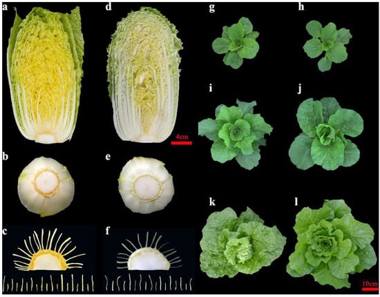 Morphological observation of two Brassica rapa lines. Sectional view of the ‘1900264′ line (a) and ‘1900262′ line (d) at the mature stage (14 weeks). Phenotypes of short stems in the ‘1900264′ line (b,c) and the ‘1900262′ line (e,f) at the mature stage (14 weeks). Phenotype of the ‘1900264′ line grown for 4 (g), 6 (i), and 10 (k) weeks. Phenotype of the ‘1900262′ line grown for 4 (h), 6 (j), and 10 (l) weeks.