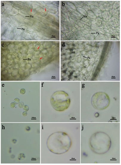 Microstructure of the inner leaves and short stems in the ‘1900262′ and ‘1900264′ lines. Microstructure of the short stem cells in the ‘1900264′ (a) and ‘1900262′ lines (b). Microstructure of the inner leaf cells in the ‘1900264′ (c) and ‘1900262′ lines (d). Inner leaf protoplasts of the ‘1900264′ (e) and ‘1900262′ lines (h) under 10× light microscope. Inner leaf protoplasts of the ‘1900264′ (f) and ‘1900262′ lines (i) under 40× light microscope. Short stem protoplasts of the ‘1900264′ (g) and ‘1900262′ lines (j) under 40× light microscope. The point of the red arrow indicates the chromoplasts. Va: vascular bundle; Pa: parenchyma cell.