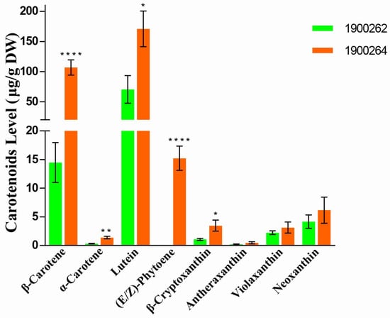Comparison of carotenoid content in the inner leaves of the ‘1900262′ and ‘1900264′ lines. Data are the average ± SE of three biological replicates. Asterisk (*) indicates that there is a statistical difference, * indicates p ≤ 0.05; ** indicates p ≤ 0.01; **** indicates p ≤ 0.0001.