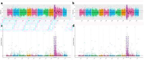 The BSA method can rapidly identify markers linked to any specific gene or genomic region []. Forty golden and non−golden individuals were selected from the tri−crossed hybrid lines to construct the golden pool (GP) and non−golden pool (NGP), respectively. After resequencing, quality control, assembly, and alignment with the B. rapa reference genome V3.0 (http://brassicadb.org, accessed on 10 February 2021), the GP contained 179.87 Mb reads (98.39% coverage) and the NGP contained 180.56 Mb reads (98.41% coverage) (Table S2). Using association analysis of the Euclidean distance (ED) algorithm [] and the △index algorithm [], the intersection association area corresponding to all SNPs and Indels was obtained. Finally, BrGOLDEN was primarily located in the 2.2 Mb region of A09 (Figure 4).