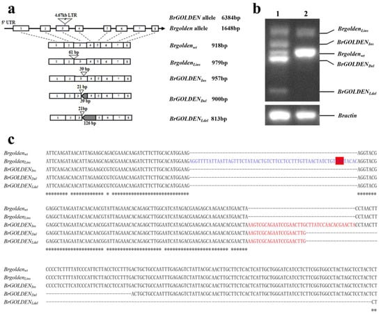 The large insertion found was a long terminal repeat (LTR) belonging to transposons, which are common in plants. Some studies have been reported in A. thaliana [], B. rapa [], and Oryza sativa [], and the proportion of transposon−related sequences in each genome accounts for 10%, 39.5%, and 46%, respectively. LTRs are the most abundant transposon type in the B. rapa genome, accounting for 27.1% []. In animals and plants, transposons are extremely rich in functions, mainly mediating the formation of new genes, gene disruption, and regulation of gene expression or activity. The effects of transposons on genes are not only manifested at the transcriptional level but also at the post−transcriptional level []. These functions provide a theoretical basis into the regulation of carotenoid metabolism by BrGOLDEN.