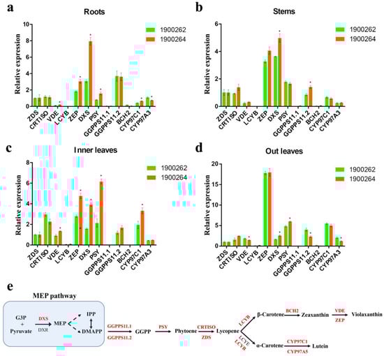 Expression of carotenoid biosynthetic genes in lines ‘1900262′ and ‘1900264′. Relative expression levels of carotenoid−synthesis−related genes in the roots (a), short stems (b), inner leaves (c), and outer leaves (d) of lines ‘1900262′ and ‘1900264′. ZDS, BraA05g040310.3C; CRTISO, BraA09g063710.3C; VDE, BraA06g005700.3C; LCYB, BraA03g017230.3C; ZEP, BraA07g016880.3C and BraA07g016890.3C; DXS, BraA01g021140.3C; PSY, BraA02g006890.3C; GGPPS11.1, BraA08g021280.3C; GGPPS11.2, BraA01g002000.3C; BCH2, BraA10g010930.3C; CYP97C1, BraA07g021850.3.5C; CYP97A3, BraA08g009810.3C. An asterisk (*) indicates that there is a statistical difference, p ≤ 0.05, n = 3. Bractin served as a control. (e) Outline of the carotenoid biosynthetic pathway. Red words indicate genes validated in the experiment.