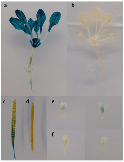 The cis−acting element of the Brgolden promoter was predicted and transgenic plants with a β−galactosidase (GUS) reporter driven by the Brgolden promoter (ProBrgolden:GUS) were generated in A. thaliana. Basic elements, such as central promoter elements (TATA−box) and enhancer elements (CAAT−box) necessary for eukaryotes, were included in the Brgolden promoter. In addition, there were several specific regulatory elements, including five light−responsive−related elements (GATA−motif, Box 4, TCT−motif, I−box, and G−box), two types of hormone−responsive cis−elements (TCA−element and ABRE), elements required for anaerobic induction (ARE), and a specific element of the roots (motif I) and seeds (RY−element) (Table 2). The GUS staining results of the three−week−old transgenic A. thaliana plants showed that GUS was expressed in the leaves, leaf veins, and petioles, but less so in the roots (Figure 8a,b). At the mature stage, there was higher GUS activity in the calyx, stigma, seed pods, and the junctions between the seed pods and seed stalks, whereas there was less GUS expression in the petals (Figure 8c–f). In summary, the Brgolden promoter may be a constitutive promoter driving GUS expression in different tissues.