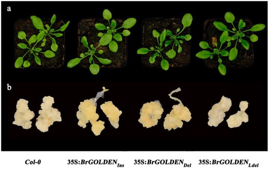 The function of BrGOLDEN was analyzed by constructing 35S:BrGOLDEN overexpressing (OE) vectors and transforming them into the A. thaliana wild type (Col−0). From the obtained transgenic lines, one OE representative line of each alternative splicing transcript (35S:BrGOLDENIns, 35S:BrGOLDENDel, and 35S:BrGOLDENLdel) was selected for the observation of phenotypic changes. All transgenic A. thaliana mutants were similar to the wild type in plant morphology and leaf phenotype (Figure 9a), which was consistent with the results of the wild type and BoORMUT B. oleracea []. This also indicates that carotenoid composition and content are in a dynamic balance in the leaf tissue for optimal photosynthesis []. Compared with the leaves, non−green tissues, such as calluses, tend to respond phenotypically to an increased carotenoid content []. In recent years, calluses have been used to rapidly characterize the function of genes involved in carotenoid biosynthesis and accumulation []. Therefore, calluses were induced from the seeds of these overexpressing A. thaliana lines and the wild type (Figure 9b). Under the same conditions, the calluses induced by 35S:BrGOLDENLdel and the wild type were nearly transparent or white, while the calluses of BrGOLDENIns and BrGOLDENDel were yellow, inferring that there was an accumulation of carotenoids. Thus, the function of BrGOLDEN was determined by different spliced transcripts.