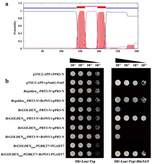 Interactions of BrPSY1 with BrGOLDEN. (a) Prediction of transmembrane helices in Brgoldenwt. The red line represents the transmembrane. The blue line represents the inside. The pink line represents the outside. Positions 142–164 and 197–219 amino acids represent transmembrane helices. The abscissa indicates the amino acid site. (b) Co−transformation of prey and bait vectors in various combinations validates protein interactions. Co−transformation of pPR3−N and pTSU2−App vectors was used as a negative control and co−transformation of pTSU2−APP and pNubG−Fe65 vectors was used as a positive control. Dilutions (1–10−4) of different concentrations of the saturated cultures were spotted onto SD/−Leu/−Trp/−His/−3AT plates.
