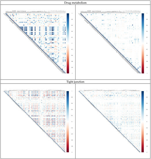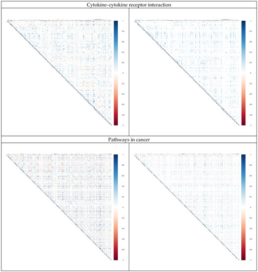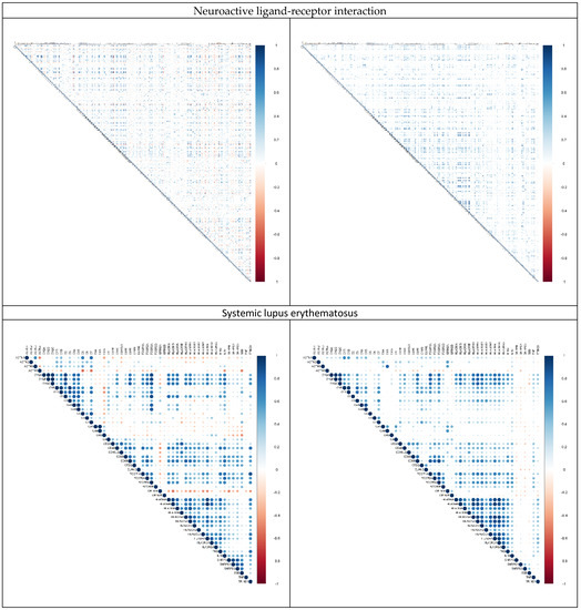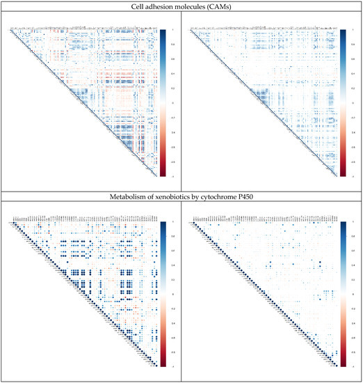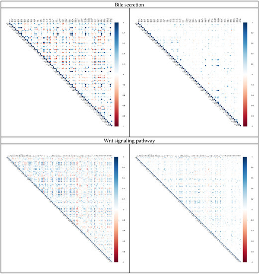Comparison of the gene pair correlations for genes in the top 10 significant biological pathways between healthy controls (left) and colon cancer patients (right). The 10 biological pathways are neuroactive ligand–receptor interaction, systemic lupus erythematosus, cytokine–cytokine receptor interaction, pathways in cancer, bile secretion, Wnt signaling pathway, cell adhesion molecules, metabolism of xenobiotics by cytochrome P450, drug metabolism, and tight junction. Positive and negative correlations were shown in blue and red, respectively.