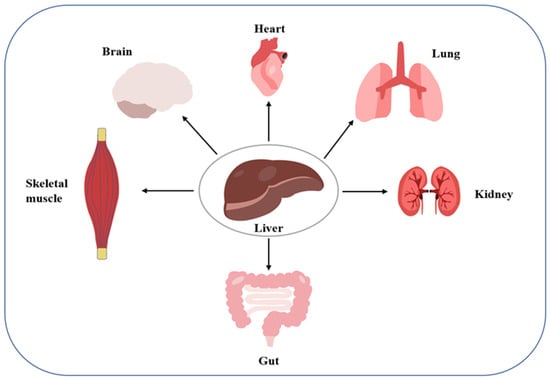 Conceptual map of organ communication, with the liver at the center of communication under physiological conditions. Depicted are the liver-heart, liver-lung, liver-kidney, liver-gut, liver-skeletal muscle, and liver-brain.