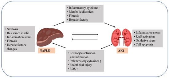 The liver receives approximately a quarter of the cardiac output, which, because of the high level of blood perfusion, allows the redistribution of hepatic factors to other tissues. Because of the unique structure and regulation of blood flow in the liver, proteins secreted by hepatocytes and non-parenchymal cells within the liver concentrate in the hepatic sinusoids, and then circulate to the heart through the central vein to the inferior vena cava, from which they are redistributed to peripheral tissues. NAFLD alters the expression of a variety of hepatic proteins and thus affects peripheral metabolism []. AKI in patients with cirrhosis is generally classified into two categories. The first type is hepatorenal syndrome-AKI, i.e., a liver-induced impairment of kidney function during the compensatory phase of liver injury. Deterioration of renal function occurs in the absence of nephrotoxic drugs and intrinsic nephropathy. The second type is AKI without the hepatorenal syndrome, which is not strongly associated with the liver and is mainly caused by inadequate renal perfusion, disturbance in bile acid metabolism, and the use of nephrotoxic drugs during the course of the disease []. Because of the proven link between organs, dysfunction of organs other than the kidney may have multiple adverse effects on the kidney, causing a recurrent course of AKI with poor treatment outcomes. Clinical data suggest that major organs, such as the lung, heart, brain, and liver, may potentially engage in cross-talk with the kidney. Therefore, dysfunction of any of these organs may increase the risk of AKI. Recent studies have identified a number of mechanisms by which other organs interact with the kidney during the onset of AKI, which allow for an abnormal activation of the immune cells, massive increase in inflammatory factor levels, mitochondrial disorders, and abnormal apoptosis in the kidney (Figure 2). Conversely, AKI could prevent organs other than the kidney from functioning properly [].