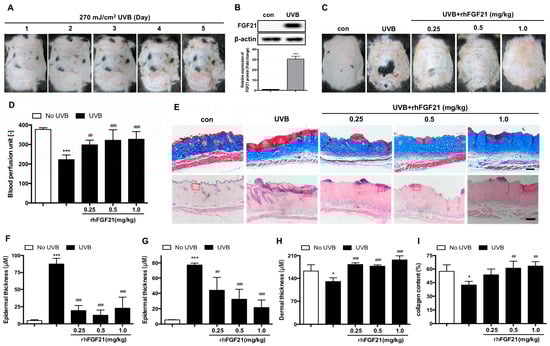 Fibroblast growth factor 21 (FGF21) is a member of the fibroblast growth factor (FGF) family that is abundantly expressed in liver and skin tissues [8,9]. FGF21 plays an important role in the regulation of various physiological and pathological processes, such as embryonic development, cell migration, proliferation and differentiation [10]. Currently, studies on FGF21 have mainly focused on tissue repair and functional protection [11,12,13]. Our previous study revealed that recombinant human FGF21 (rhFGF21) promoted wound healing in diabetic mice [14]. It has been reported that FGF21 protects the blood–brain barrier from traumatic brain injury [15]. However, whether FGF21 protects skin tissues against UVB irradiation effects is unclear. Therefore, the effects of FGF21 on UVB-injured skin were the focus of this study.