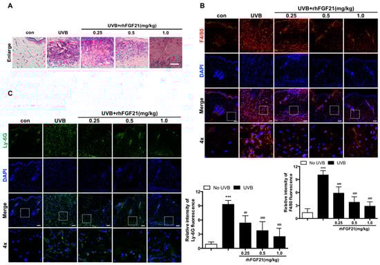 RhFGF21 inhibited inflammatory cell infiltration in UVB-irradiated mouse skin. (A) HE staining (n = 4). Scale bar = 25 μm. Local enlarged picture in HE staining (Figure 1E). (B,C) Immunofluorescence confocal microscopy images of F4/80 and Ly-6G in UVB-irradiated mouse skin tissues. Scale bar = 100 μm. The Data are presented as means ± SD. *** p < 0.001 versus mice without UVB-irradiation exposure; ## p < 0.01, ### p < 0.001 versus UVB-irradiated mice. The data are presented as means ± SD. *** p < 0.001 versus mice without UVB irradiation exposure; ## p < 0.01, ### p < 0.001 versus UVB-irradiated mice.