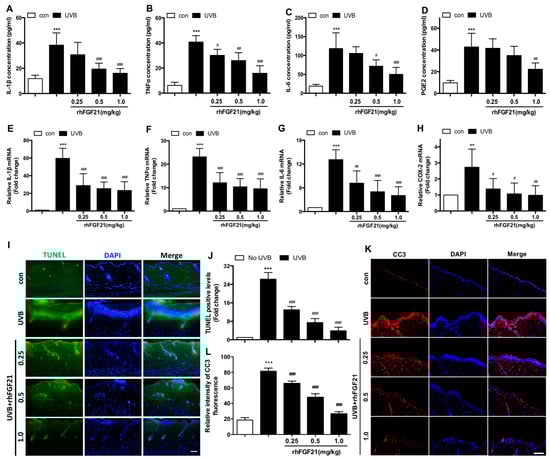 RhFGF21 inhibited inflammatory response and epidermal cell apoptosis in UVB-irradi ated skin in mice. (A–D) Levels of IL-1β, TNFα, IL-6 and PGE2 in mouse serum were measured by ELISA kits. (n = 6). (E–H) The mRNA levels of IL-1β, TNFα, IL-6 and COX-2 in skin tissues were measured by RT-PCR. (n = 6). (I,J) Cell apoptosis in damaged skin tissues was evaluated by TUNEL staining. Scale bar = 50 μm. The apoptosis-positive cell levels were quantified. (n = 3). (J,K) The expression of cleaved caspase-3 (CC3) was analyzed and quantified by confocal microscopy and Image J, respectively. Red fluorescence represents the expression of CC3 protein, blue fluorescence represents nucleus DAPI. Scale bar = 100 μm. Data are presented as means ± SD. ** p < 0.01, *** p < 0.001 versus mice without UVB-irradiation exposure; # p < 0.05, ## p < 0.01, ### p < 0.001 versus UVB-irradiated mice.