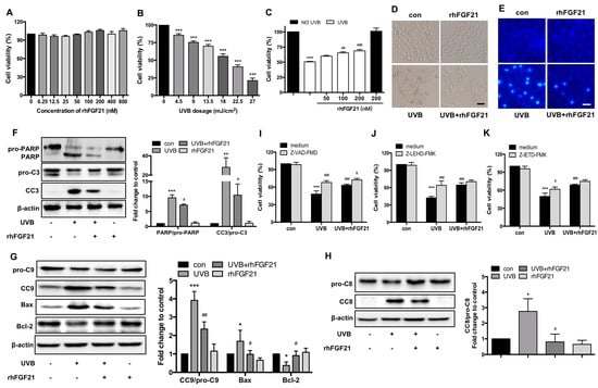 Treatment with rhFGF21 protects HaCaT cells from UVB-induced apoptosis. (A) The effect of rhFGF21 on HaCaT cell viability. Cell viability was assessed by MTT assay. (B) The effect of UVB on the viability of HaCaT cells. Cell viability was assessed by MTT assay. (C) The effect of rhFGF21 on the viability of UVB-irradiated HaCaT cells. Cell viability was assessed by MTT assay. (D) Morphological images observed by phase contrast microscopy. Scale bar = 50 μm. (E) Fluorescence microscopic images of cells stained with Hoechst 33258. Scale bar = 25 μm. (F) Western blot analysis of PARP, pro-caspase-3 (pro-C3) and active caspase-3 (CC3). Quantitative analysis of the intensity of PARP, pro-C3 and CC3. (G,H) The protein levels of pro-caspase-9, active caspase-9, Bax, Bcl-2, pro-caspase-8 (pro-C8) and active caspase-8 (CC8) were detected and quantified by Western blot and ImageJ, respectively. (I–K) Viability of cells treated with Z-VAD, Z-LEHD and Z-IETD, respectively. Cell viability was evaluated by MTT assay. Data are the means ± SD of three independent experiments, * p < 0.05, ** p < 0.01, *** p < 0.001 versus HaCaT cells without UVB radiation exposure; # p < 0.05, ## p < 0.01, ### p < 0.001 versus UVB-irradiated HaCaT cells; & p < 0.05 versus rhFGF21-treated HaCaT cells injured by UVB irradiation.