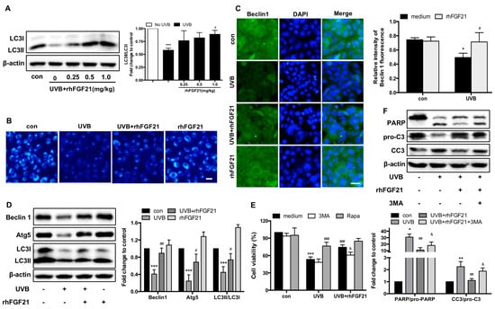 It has been reported that autophagy induced by silibinin protects human epidermoid carcinoma A431 cells from UVB-induced apoptosis [2] Therefore, we hypothesized that rhFGF21 rescues UVB-irradiated HaCaT cells by inducing autophagy. To verify our hypothesis, we added an autophagy inhibitor (3-methyladenine, 3MA) or autophagy activator (rapamycin) to the cell culture. We found that 3MA inhibited the viability enhancement effect of rhFGF21 in UVB-irradiated HaCaT cells, while rapamycin increased the viability enhancement effect of rhFGF21 in UVB-irradiated HaCaT cells (Figure 5E). Consistent with the cell viability results, rhFGF21 inhibited the expression of active PARP and cleaved caspase-3 protein in UVB-irradiated HaCaT cells, whereas 3MA reversed their expression (Figure 5F). These results revealed that rhFGF21-enhanced autophagy might play a positive role in cell apoptosis induced by UVB irradiation.