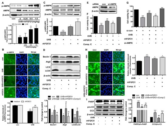 RhFGF21 protects HaCaT cells from UVB-induced apoptosis by activating AMPK-mediated autophagy. (A) The expression of p-AMPK and AMPK proteins in epidermal cells were detected by Western blot analysis, and quantitative analysis of the intensity of p-AMPK/AMPK. (B) Immunofluorescence confocal microscopy images of p-AMPK in HaCaT cells. Green fluorescence represents the expression of p-AMPK protein, blue fluorescence represents nucleus DAPI. Scale bar = 25 μm. Quantitative analysis of the intensity of p-AMPK. Scale bar = 25 μm. Quantitative analysis of the intensity of p-AMPK. (C) The expression of p-AMPK and AMPK proteins were detected by Western blot analysis, and quantitative analysis of the intensity of p-AMPK/AMPK. (D) Cells treated with AMPK inhibitor (Compound C, Comp. C, 1 mM). The protein levels of Beclin 1, Atg5 and LC3 were determined by Western blot and quantified by Western blot and ImageJ, respectively. (E) AMPK expression was silenced by transfection with siRNA. (F,G) Effect of inhibiting or silencing AMPK on cell viability. Comp. C, 1 mM; si-AMPK, 20 nM. (H) Cellular expression of active caspase-3 was analyzed by confocal microscopy. Green fluorescence represents the expression of active caspase-3 (CC3) protein, blue fluorescence represents nucleus DAPI. Scale bar = 25 μm. (I) The protein levels of PARP, pro-caspase 3 (pro-C3) and active caspase 3 (CC3) were detected by Western blot and quantified by Western blot and ImageJ, respectively. Data are means ± SD of three independent experiments, * p < 0.05, ** p < 0.01, *** p < 0.001 versus epidermal cells or HaCaT cells not exposed to UVB radiation; # p < 0.05, ## p < 0.01, ### p < 0.001 versus UVB-irradiated epidermal cells or HaCaT cells; & p < 0.05, && p < 0.01, &&& p < 0.001 versus rhFGF21-treated HaCaT cells injured by UVB irradiation.