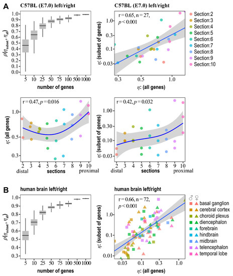 Although RNA-seq is widely adopted in studies of the dynamics of transcriptomic landscapes, RT-qPCR remains the method of choice for diagnostics. Thus, we wondered whether the pulled “intrinsic” gene noise for the entire transcriptional landscape could be estimated from a subset of genes for an individual. To this end, we used gene expressions measured on the left/right sides of the epiblast of C57BL/6 embryos at stage E7.0 [41]. The RNA-seq data (GSE65924) represented three embryos sliced into 11 segments (for the analysis, we used the data from 9 slices) along the anterior–posterior axis, thus yielding 27 individual, paired samples. We also used RNA-seq data (E-MTAB-4840) for the left/right paired human embryo brain transcriptomes of the 8–14-weeks-post-conception embryos [42]. In total, 72 paired human embryo samples from different brain structures were used for the analysis. The mRNA counts were normalized as FPKM (fragments per kilobase per million) and log-transformed. A further analysis was performed for genes with non-zero expression across all the samples (~9500 genes for mice and ~22,900 for humans). Following PCA for each paired sample, we evaluated pulled “intrinsic” gene noise as (see Equation (14)). Then, we formed 1000 subsets, each consisting of 5, 10, 25, 50, 75, 100, 500, and 1000 randomly selected genes, and estimated the pulled “intrinsic” gene noise for each subset. We noted a significant correlation between and , even for the subsets consisting of five genes (Figure 1). Starting from genes, the median correlation of pulled “intrinsic” gene noise evaluated on all genes and random subsets was for mice and for humans (Figure 1). It quickly approximated 1, starting from 100 genes (Figure 1). Thus, we concluded that the pulled “intrinsic” noise of the entire transcriptional landscape could be deduced from a small subset of genes () with good to very high accuracy.
