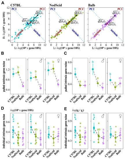 The impact of mother–fetus MHC-mediated immunogenic cross-talk on the “extrinsic”/“intrinsic” gene noise in C57BL/6J embryos. (A) PCA decomposition of 18S rRNA-normalized-log-transformed gene expressions in the left () and right () forelimbs of C57BL/6J embryos on day 16.5 of gestation. The embryos were carried by C57BL/6J (n = 11 embryos carried by m = 8 females), NOD-SCID (n = 12, m = 8), and BALB/c (n = 12, m = 7) surrogate mothers. The PC1 and PC2 axis and eigenvectors , , and are indicated, where corresponds to the 1st eigenvalue of a gene-wise, mean-centered left/right expression matrix. (B,C) Mother–embryo interaction has an impact on pulled “extrinsic” () (B) and “intrinsic” () (C) gene expression noise estimated group-wise for C57BL/6J embryos developing in C57BL/6J, NOD-SCID, and BALB/c surrogate mothers. The estimates were determined for either each mother’s genotype or separately for each mother’s genotype and fetus sex: C57BL/6J (n♂ = 6, n♀ = 5), NOD SCID (n♂ = 6, n♀ = 6), and BALB/c (n♂ = 5, n♀ = 7). Circles correspond to GAMLSS model-estimated coefficients: (B) and (C) , and whiskers denote 95% confidence intervals. Letters indicate significant between-group differences at FDR < 0.05 for multiple comparisons of the model-estimated coefficients by Wald tests. (D,E) Estimations of pulled “intrinsic” gene noise (, Equation (14)) for each embryo using left ()/right () 18S rRNA-normalized gene expressions (D) or s of all pair-wise gene combinations (E). Squares (♂) and triangles (♀) indicate individual values of pulled “intrinsic” gene noise, circles—mean values for each surrogate mother group, and whiskers—95% confidence intervals. Letters indicate multiple t-test comparisons with significant differences at FDR < 0.05.