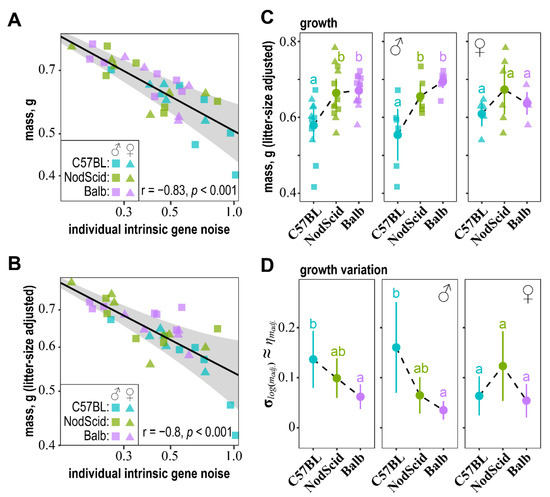 Relationships between embryos pulled “intrinsic” gene noise, their mass, and phenotypic noise. (A,B) GAMLSS models of the relations of non-adjusted (A) and litter-size-adjusted (B) C57BL/6J embryonic mass () with individual estimates of the pulled “intrinsic” gene noise (, Figure 2D). Grey ribbons indicate the model-estimated 25–75 centile region for the normally-distributed . Correlation coefficients are indicated in the bottom-right corner; the GAMLSS model coefficients are given in Table S3. Squares indicate male embryos, and triangles represent female embryos. Surrogate mother groups C57BL/6J, NOD-SCID, and BALB/c are color-coded. (C) Litter-size-adjusted mass of C57BL/6J embryos developed in C57BL/6J, NOD-SCID, and BALB/c surrogate mothers on day 16.5 of pregnancy, for which gene noise (Figure 2) and sex (squares—♂, triangles—♀) were determined. Circles indicate means for each surrogate mother group, whiskers—95% confidence intervals, and letters—multiple t-test comparisons with significant differences at FDR < 0.05. (D) GAMLSS estimation of the effect of surrogate mothers’ MHC haplotype on the noise of litter-size-adjusted-log-transformed embryonic mass (). The two parameters (, ) were fitted simultaneously: (1) and (2) , under the assumption that is normally distributed. Circles correspond to the GAMLSS model estimated , whiskers correspond to 95% confidence intervals, and letters indicate significant between-group differences at FDR < 0.05.