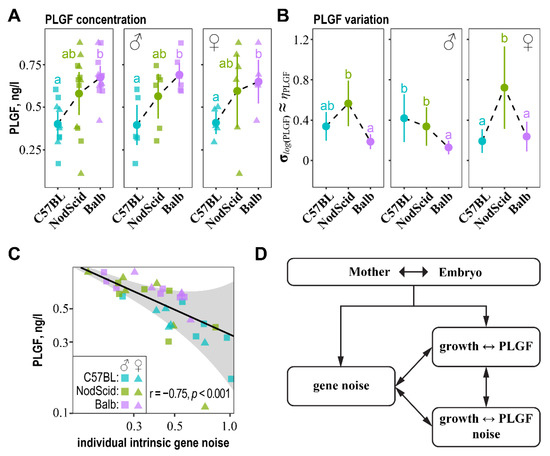 Relationships between PLGF, PLGF noise, and pulled “intrinsic” gene noise. (A) PLGF concentrations in placentas of C57BL/6J embryos developed in C57BL/6J, NOD-SCID, and BALB/c surrogate mothers on day 16.5 of pregnancy. Circles indicate means, whiskers—95% confidence intervals, and letters—significant differences at FDR < 0.05. (B) GAMLSS estimations of noise in PLGF concentrations. Circles indicate , whiskers—95% confidence intervals, and letters—significant differences at FDR < 0.05. (C) GAMLSS model of the relations of placental PLGF () with individual estimates of the pulled “intrinsic” gene noise (). Grey ribbon indicates a 25–75 centile region. Correlation is shown in the bottom-right corner; the model coefficients are given in Table S4. (D) A model depicting the cross-talk between transcriptional stability (gene noise), PLGF levels, embryonic growth, and fluctuations in PLGF and embryonic growth mediated by mother–fetus MHC immune interactions (see main text for details).