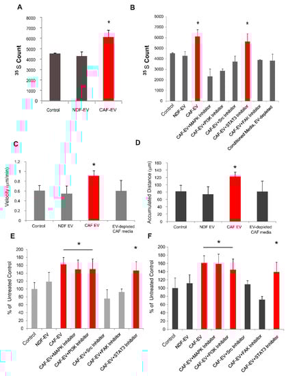 2.5. CAF-Derived EVs Increase Motility of Normal Mesothelial Cells