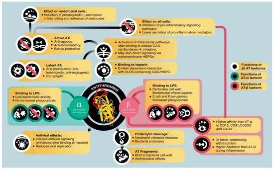 Functions and effects of antithrombin in host defense and inflammation. Note: AT, antithrombin; LPS, lipopolysaccharide; HSPG, heparan sulfate proteoglycans; GAG, glycosaminoglycans. Reproduced without modification from Schlömmer et al. 2021 [50] (accessed on 24 September 2022), under a Creative Commons Attribution-NonCommercial-NoDerivatives 4.0 International (CC BY-NC-ND 4.0) License (https://creativecommons.org/licenses/by-nc-nd/4.0/ (accessed on 24 September 2022). Copyright © 2021, The Authors. This reuse has not been endorsed by the licensor. The source reference is “[50]” and is available at https://www.mdpi.com/1422-0067/22/8/4283.