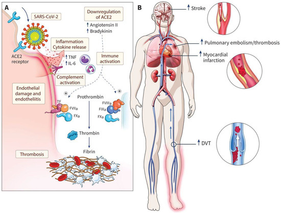 Possible mechanisms for thrombosis in coronavirus disease 2019 (COVID-19) and clinical consequences. (A) Injury to the endothelium initiated by severe acute respiratory syndrome coronavirus 2 (SARS-CoV-2) entry into cells via the angiotensin-converting enzyme 2 (ACE2) receptor is thought to lead to diffuse endotheliitis. The endothelial damage may result in an inflammatory host response characterized by excessive immune activation and cytokine storm, which promotes hypercoagulability and thrombosis. (B) Possible venous and arterial thrombotic complications associated with COVID-19. Original illustration by freelance medical illustrator Gail Rudakevich. Reprinted with permission from Ref. [15]. Copyright ©2021, Canadian Medical Association. Abbreviations: DVT, deep vein thrombosis; FVIIa, factor VIIA; IL-6, interleukin 6; PE, pulmonary embolism; TF, tissue factor; TNF, tumor necrosis factor α.