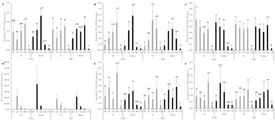 Regardless of the diet or whether fish were fed the control feed (CTRL) regime, stress induced a fast up-regulation (mostly found at early sampling points) of several pro-inflammatory genes (Figure 1 and Table S1), compared the last sampling points, 48 and 72 h. Most importantly, when comparing the response of fish reared under stressful conditions to the undisturbed (Ø) counterparts, when the immune mechanisms were activated, a down-regulation of tnfα (Figure 1B), cd8α (Figure 1E), cd3zeta (Figure 1H), tcrα (Figure 1I), afmid (Figure 1K), and ido2 (Figure 1L) at 48 h was observed. In addition, tgfα (Figure 1A) was found to be up-regulated by stress at 4 and 24 h. On the other hand, high stocking density led to the up-regulation of tgfβ (Figure 1A), il1β (Table S1), cd8β (Figure 1F), and afmid (Figure 1K) at 4 h, tgfβ (Figure 1A) and tnfα (Figure 1B) at 24 h, and tgfβ (Figure 1A) and cd8β (Figure 1F) at 48 h.