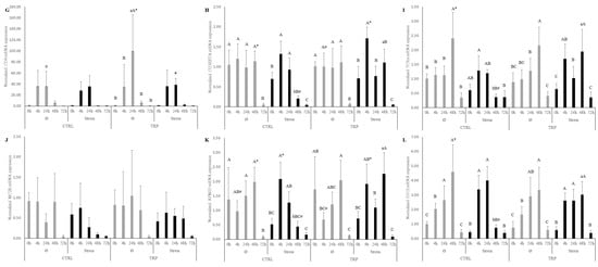Regardless of the stress condition and inflammatory status, tryptophan dietary supplementation was responsible for a reduction in plasma bactericidal activity (Table 3). Moreover, irrespective to stress, 4 h after infection, the Phdp fish fed TRP presented lower MCV (Table 1) and gut SOD concentration (Table 4) than the CTRL-fed fish. Head kidney gene expression showed a down-regulation of il1β (Table S1) at 4 h and cd8α (Figure 1E) at 48 h following infection in fish fed TRP, while presenting a higher expression of tnfα (Figure 1B) at 24 h than that of the CTRL-fed fish. Moreover, fish fed TRP under stressful rearing conditions reduced cortisol 4 h after inflammation (Table 3), while displaying a general up-regulation of genes such as tgfβ (Figure 1A), cxcr4 (Figure 1C), cd8α (Figure 1E), cd8β (Figure 1F), cd3zeta (Figure 1H), tcrα (Figure 1I), afmid (Figure 1K), and ido2 (Figure 1L) at 48 h, compared to CTRL-fed individuals. Finally, the expressions of tgfβ (Figure 1A) and tnfα (Figure 1B) at 24 h and cd8β (Figure 1F) at 4 h were found to be decreased, compared to the CTRL-fed counterparts.