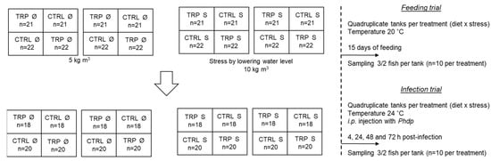 European seabass juveniles (12.02 ± 2.77 g) were randomly distributed (n = 21–22 per tank) in two independent recirculating seawater systems, composed of a total of 16 tanks (Figure 2), at a density of 5 kg m−3 and maintained for a 2-week acclimatization period (temperature 20 ± 0.5 °C; salinity 32 ppt; photoperiod 10:14 h dark: light). Afterwards, by lowering the water level in one of the systems, fish were submitted to a higher density (10 kg m−3; stress group) to simulate a stressful rearing condition, while the other system served as control for the stocking density factor (5 kg m−3; Ø group). In a completely randomized design (Figure 2 serves only as example of diet distribution), the two dietary treatments (CTRL and TRP) were randomly assigned in quadruplicate tanks in each recirculating seawater system, and fish were fed these diets for 15 days, twice a day, with a daily average ration of 2% of body weight. Samplings were then carried out (n = 2–3 fish per tank, n = 10 per treatment) for the collection of data, regarding the haematological profile, peritoneal cells collection, plasma cortisol, and immune parameters. In addition, gut samples were collected for innate immune and oxidative stress analysis. Finally, head kidney was sampled for gene expression analysis. Afterwards, the remaining fish were intraperitoneally (i.p.) injected with 100 μL of Phdp (5 × 107 cfu mL−1). At that point, temperature was increased up to 24 ± 0.5 °C to mimic the natural infection conditions and, similarly to the previous point, fish were sampled (n = 2–3 fish per tank, n = 10 per treatment) after 4, 24, 48, and 72 h. For all the sampling points, fish were euthanized by anaesthetic overdose with 2-phenoxyethanol (1 mL L−1, Merck KGaA).