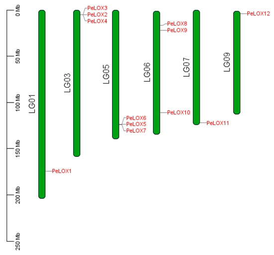 A total of 18 possible LOX members were retrieved by BlastP and HMM Search. Six short sequences and incomplete sequences of the lipoxygenase domain were removed after SMART filtering, and, finally, 12 PeLOX protein sequences were obtained (Table 1). In total, 12 PeLOX genes were distributed on 6 chromosomes (Figure 1); PeLOX2/3/4 and PeLOX5/6/7 were connected in tandem and distributed on chromosomes 3 and 5, respectively, indicating their high homology and possibly similar functions. The amino acid sequence length ranged from 472 to 933 aa, with an average length of 822 aa, and the theoretical pI ranged from 5.42 to 9.16. Subcellular location prediction results showed that all 12 PeLOX proteins were located in the cytoplasm, nucleus, and chloroplast. The secondary structure prediction results showed that the α-helix (30.61–46.40%), extended chain (1.69–8.39%), and random coils (51.89–64.32%) were scattered throughout the protein, with random coils accounting for the majority.