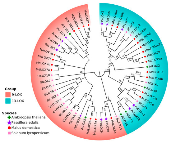 A multiple alignment analysis between the passion fruit, Arabidopsis thaliana, apple (Malus domestica), and tomato (Solanum lycopersicum) LOX proteins were carried out using MAFFT-7.490 (https://mafft.cbrc.jp/alignment/software/), and the Neighbor-Joining phylogenetic tree of these LOX proteins was created in MEGA X with bootstrap 1000. ChiPlot (https://www.chiplot.online/) was used to decorate beautification the phylogenetic tree.