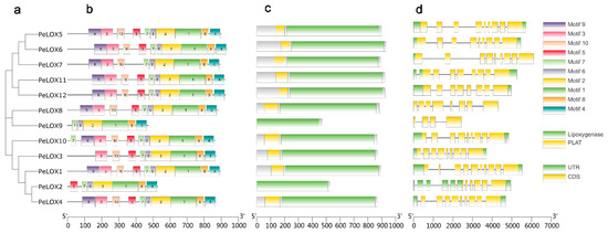 Phylogenetic relationships, gene architecture of conserved protein motifs and gene structure in PeLOX genes. (a) Phylogenetic tree based on the PeLOX genes sequence. (b) The motif composition of PeLOX family. Different colored boxes display different motifs. (c) Batch CD result of PeLOX genes, most of the members contained the conserved Lipoxygenase and PLAT domains. (d) The exon–intron structure of PeLOX genes.