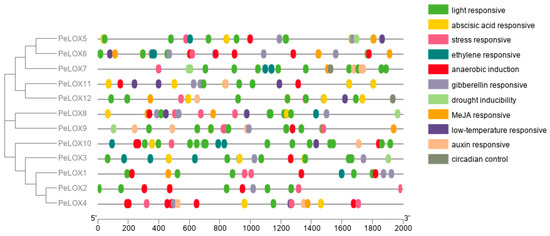 Cis-acting elements are the binding sites of transcription factors and are involved in regulating the exact initiation and efficiency of gene transcription. Cis-acting element prediction could help us to further understand gene expression and regulation. Here, the −2000 bp sequence upstream of the PeLOX genes’ transcription start site was extracted and cis-acting elements were predicted using the PlantCARE online database. The prediction results showed that, in addition to the enhancer TATA box, CAAT box, and other elements, it also included light response elements G-box (TACGTG, CACGTG, CACGTC, CACGTT) and TCT-motif (TCTTAC), ABA response element ABRE (ACGTG), anaerobic sensing element ARE (AAACCA), gibberellin response element P-box (CCTTTTG), MeJA response element CGTCA-motif, and auxin response element TGA-element (AACGAC), stress response element STRE (AGGGG), ethylene-responsive element ERE (ATTTTAAA, ATTTCATA), and low-temperature response element LTR (CCGAAA) (Figure 5), indicating that the PeLOXs are involved in plant growth and development, hormone responses, and abiotic stress.