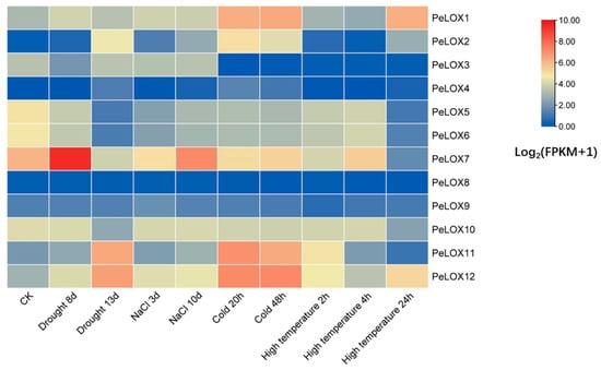 RNA-seq data were used to study the expression profiles of PeLOX genes under different abiotic stresses (drought stress, salt stress, cold stress, and high-temperature stress) (Figure 6; Table S2). The results showed that the different PeLOX genes responded to different abiotic stresses to varying degrees, among which PeLOX1, PeLOX2, PeLOX7, PeLOX11, and PeLOX12 responded significantly to various abiotic stresses, while PeLOX8 and PeLOX9 showed little change in expression under all stresses. The genes induced by drought stress included PeLOX2, PeLOX4, PeLOX11, and PeLOX12; the genes that first rose and then fell included PeLOX1 and PeLOX7, among which PeLOX7 had the highest expression level when the soil moisture was 50%; PeLOX5, PeLOX6, and PeLOX10 were downregulated by drought stress; PeLOX3 was first downregulated and then upregulated, while PeLOX8 and PeLOX9 were not induced by drought stress. Some genes were induced with the increase in salt stress, including PeLOX1, PeLOX2, PeLOX11, and PeLOX12; meanwhile, PeLOX5, PeLOX6, and PeLOX7 showed first a downward and then an upward trend, among which PeLOX7 had the highest expression level at 10 days of salt-stress treatment. The expression levels of PeLOX3, PeLOX4, and PeLOX9 did not change significantly with the increase in salt stress.
