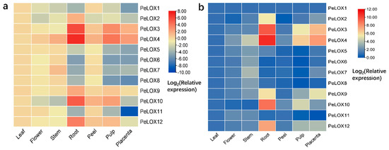 Expression profiles of PeLOX genes in various tissues of passion fruit. The expression of different PeLOX genes were normalized against the expression of leaf (a) and PeLOX1 (b) in particular tissue. Blue indicates a low expression level and red indicates a high expression level.