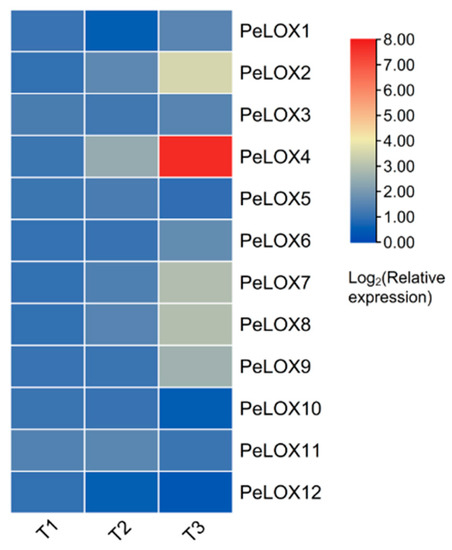 The relative expression of PeLOX genes at three different fruit development stages in passion fruit was analyzed via qRT-PCR. The expression level of T1 was used as a reference in the standardization of the relative expression level data. The results (Figure 8; Table S4) showed that PeLOX10 and PeLOX12 decreased with the increase in fruit development and maturity, while PeLOX2, PeLOX4, PeLOX6, PeLOX7, PeLOX8, and PeLOX9 were upregulated, and the qRT-PCR expression trend of PeLOX2, PeLOX4, PeLOX10, PeLOX11, and PeLOX12 were consistent with the RNA-seq results (Figure S1). It is noteworthy that the expression level of PeLOX4 was much higher than that of other family members, which was extremely significant, and the relative expression level of PeLOX4 increased by 3.7 times and 46.5 times from T1 to T2 and from T2 to T3 with the increase in fruit development and ripeness, respectively. In addition, the expression level of PeLOX3, PeLOX5, and PeLOX11 did not change significantly with fruit development and ripening.