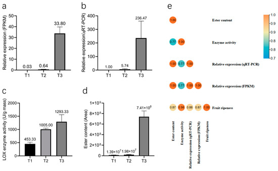 Histogram of PeLOX4 relative expression, LOX enzyme activity and ester content in three different fruit development stages. (a) Histogram of PeLOX4 relative expression via RNA-seq. (b) Histogram of PeLOX4 relative expression via qRT-PCR. (c) Histogram of LOX enzyme activity. (d) Histogram of ester content. (e) Pearson correlation analysis of fruit ripeness, relative expression of PeLOX4, LOX enzyme activity and ester content.