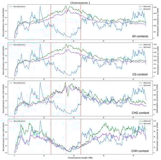 The count of methylated cytosines is assessed within genes, transposons, and retrotransposons and compared to recombination rates (Supplementary Materials Figures S1 and S2). The analysis shows that methylated cytosine count in genes, transposons, and retrotransposons is negatively correlated with recombination rates when evaluated for all contexts together (Supplementary Materials Figure S3). This indicates that methylation inside these entities is higher when recombination is lower. The same negative trend is observed when methylated cytosines are analyzed in CG and CHG contexts. Methylation events in transposons and retrotransposons are associated with the prevention of their expression and movement in chromosomes, which can be damageable to the organism and even deleterious [23,26]. It should be noted that these methylation events can also affect surrounding genomic regions [26], potentially influencing the methylation status of nearby genes. In genes, methylation usually occurs at the promoters or within the body of the transcribed gene, inhibiting their expression [8]. However, the methylated cytosines in the CHH context are also positively correlated with the recombination rates. This is a consequence of low CHH methylation near the centromere region and greater presence in the chromosome arms. Gallo-Franco et al. [27] reported high CHH methylation levels of transposable elements close to genes in rice, which supports the conclusion of Martin et al. [28] for grass species that long genes and genes close to transposable elements tend to have CHH islands more frequently. It could be hypothesized that the presence of these CHH islands is promoting the positive correlation between methylation and recombination in gene-rich regions.