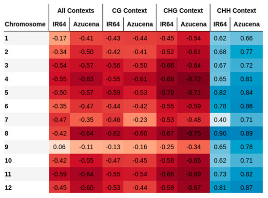 Chromosomal regions close to the centromere have a high incidence on methylation. When only the chromosome arms are evaluated, correlation trends change, from being high negative to being negative, for all contexts evaluated together and for the CG and CHG contexts evaluated independently (Figure 6). For CHH methylation, the markedly positive correlation also decreases but is still positive. In the context centromere regions are evaluated, negative correlations are evidenced in all contexts when they are evaluated together and for CG and CHG contexts independently. These results are in agreement with the reported importance of DNA methylation for plant chromosomal interactions in pericentromeric regions [9]. They also agree with the results obtained by Habu et al. [15], who indicate that the position and frequency of meiotic recombination in the centromeric heterochromatin of rice are regulated by the epigenetic state of the chromatin. With respect to methylation in CHH contexts, the correlation of the centromere region is positive but weaker than that of the whole chromosome (Figure 6).