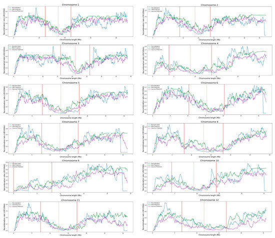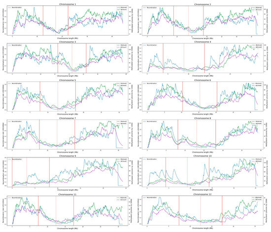 In this study, the correlation between recombination rates and the methylated cytosine counts for all chromosomes in two rice cultivars is evaluated (Figure 1 and Figure 2). The correlation values are, on average, −0.44 ± 0.17 for all chromosomes of both varieties, with higher values in the centromere region. Similar results in rice were previously described by Yan et al. [17], revealing that DNA methylation patterns in the centromere are shaped by the DNA sequence and the centromeric domains. Habu et al. [15] described how artificial chromatin modification can vary the frequency of meiotic recombination. Overall, high levels of methylation in heterochromatin regions near the centromeres have been reported as a common pattern, where meiotic recombination is repressed. In the same way, recombination-free regions around centromeres are likely to be important for normal centromere function during meiosis [15,18].