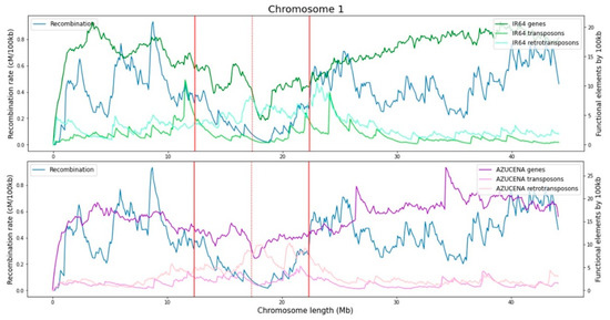 Genes, transposons, and retrotransposons compared to cross over recombination through chromosome 1 for rice varieties IR64 and Azucena. The centromere is represented by a red dotted line and the influence of the centromere region in recombination by solid red lines.