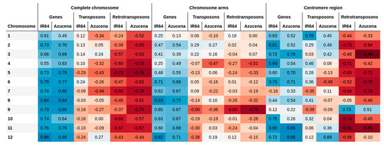 Correlations between recombination rates and the number of genes, transposons, and retrotransposons rates for rice varieties IR64 and Azucena. Blue and red colors correspond to positive and negative correlations, respectively. The higher the correlation value, the higher the color intensity.